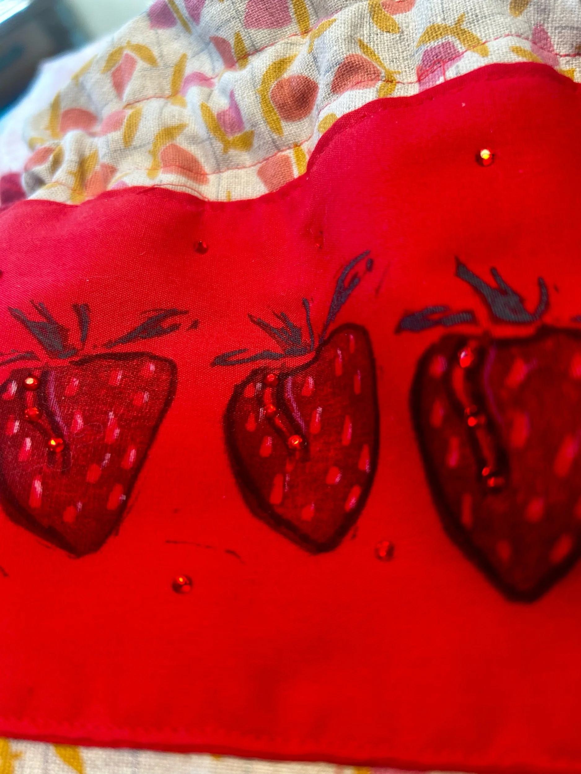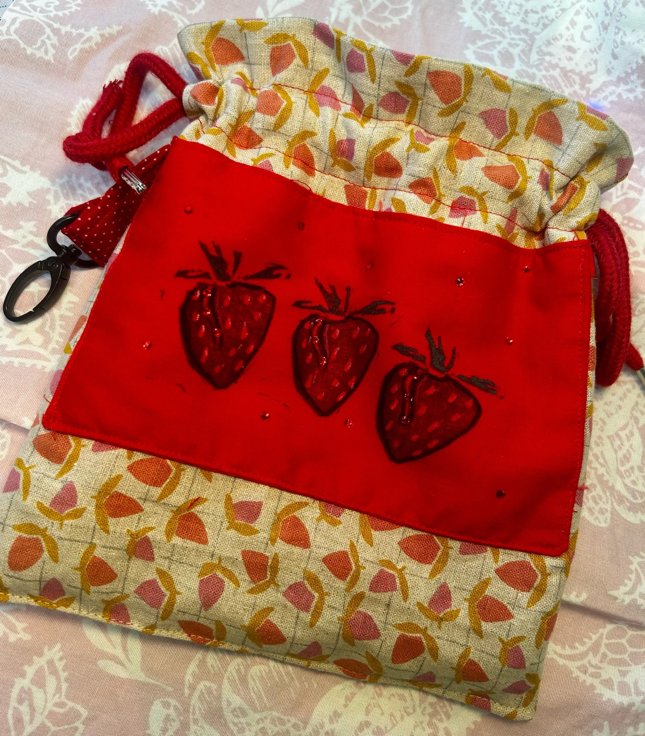 Everyone needs a drawstring bag that you can clip onto your belt loop, large bag, luggage, backpack, wristlet. This is an original linocut strawberry print with rhinestones embellishments.